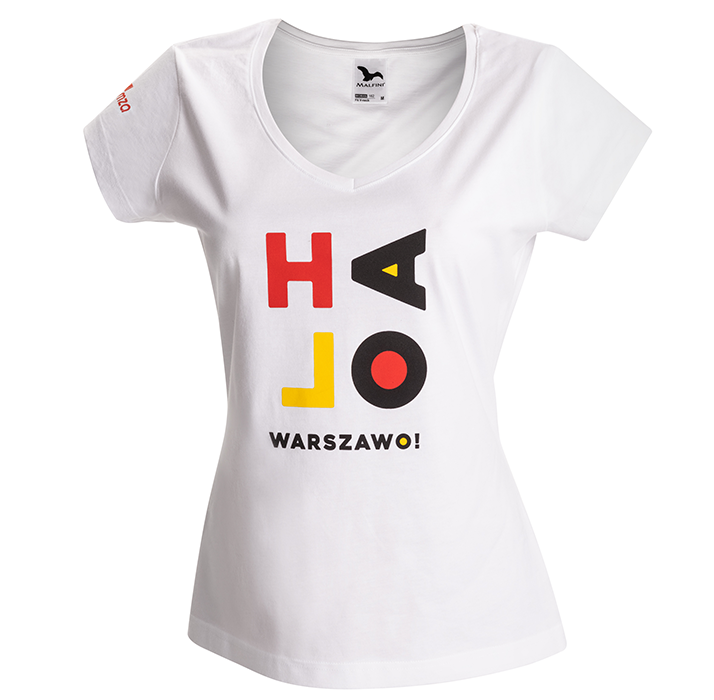 Koszulka damska z dekoltem w serek, taliowana z napisem „Halo Warszawo!”. Wykonana z wysokiej jakości bawełny.Skład: bawełna 100%.Gramatura: 180 g/m².