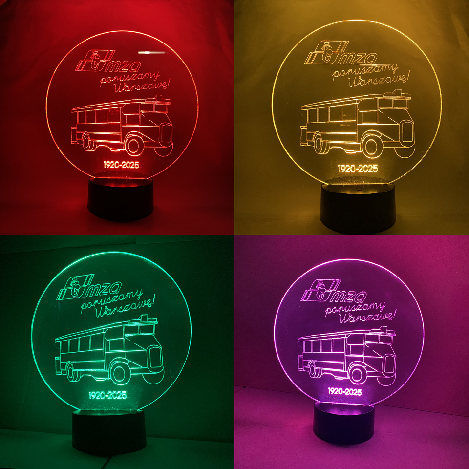 Grawerowany wzór (model autobusu Somua i logo MZA) podświetla się, gdy podstawka jest włączona, dając efekt hologramu w wielu kolorach do wyboru.