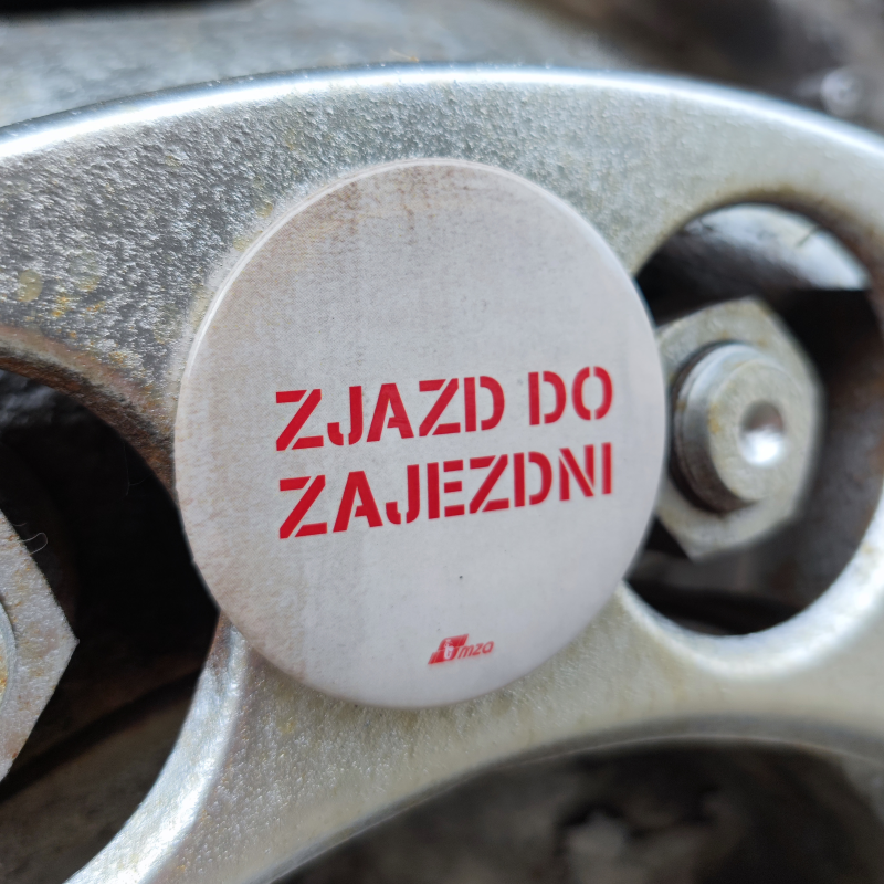 Magnes dekoracyjny z napisem „Zjazd do zajezdni”.