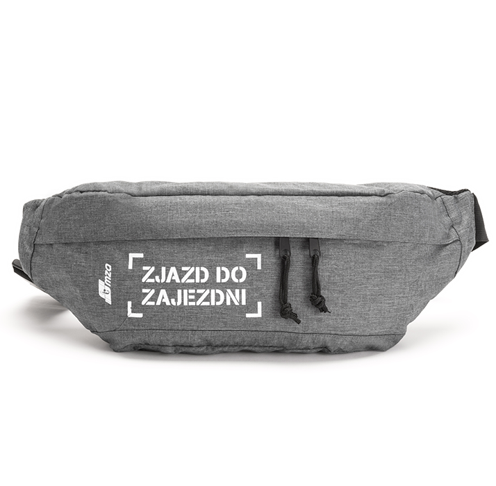 Ciemnoszara nerka z napisem „Zjazd do zajezdni” o dużej pojemności. Z powodzeniem może zastąpić plecak. Ma główną komorę oraz wewnętrzne kieszenie i kieszeń na tylnym panelu. Saszetka posiada regulowany pasek biodrowy z bezpiecznym zapięciem na zatrzask. Może być noszona na kilka sposobów.