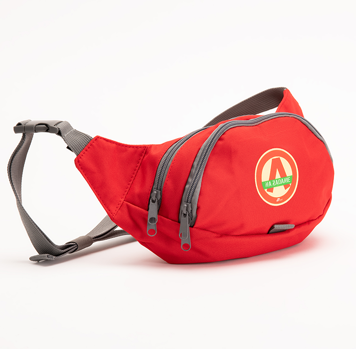 Saszetka materiałowa typu nerka z retro piktogramem „Przystanek na żądanie”. Posiada dwie kieszenie zamykane na zamek błyskawiczny – główną komorę oraz mniejszą z przodu. Nerka posiada regulowany pas biodrowy, a jej tył jest wyściełany dodatkową warstwą materiału.