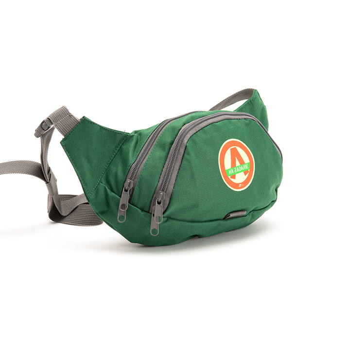Saszetka materiałowa typu nerka z retro piktogramem „Przystanek na żądanie”. Posiada dwie kieszenie zamykane na zamek błyskawiczny – główną komorę oraz mniejszą z przodu. Nerka posiada regulowany pas biodrowy, a jej tył jest wyściełany dodatkową warstwą materiału.