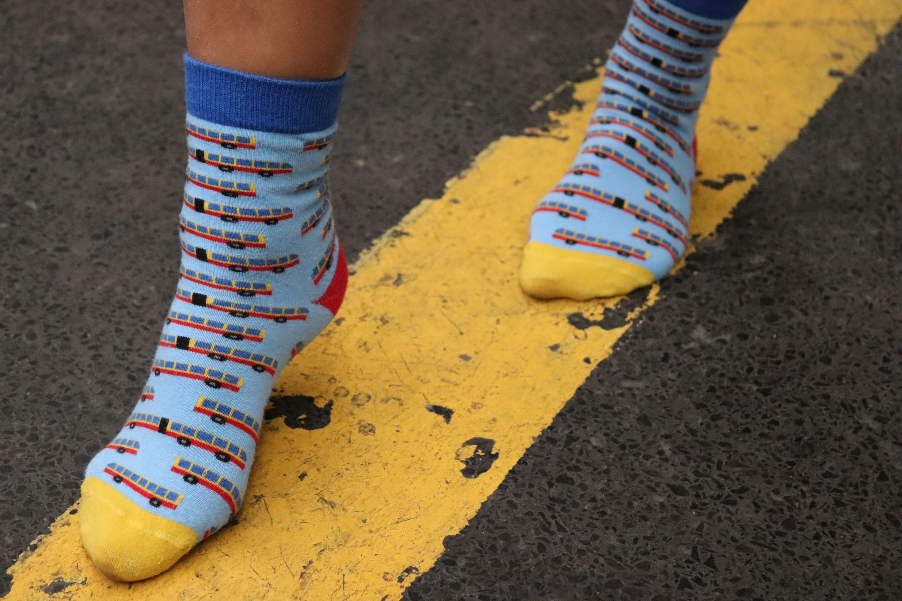 Kolorowe skarpetki z motywem autobusów.