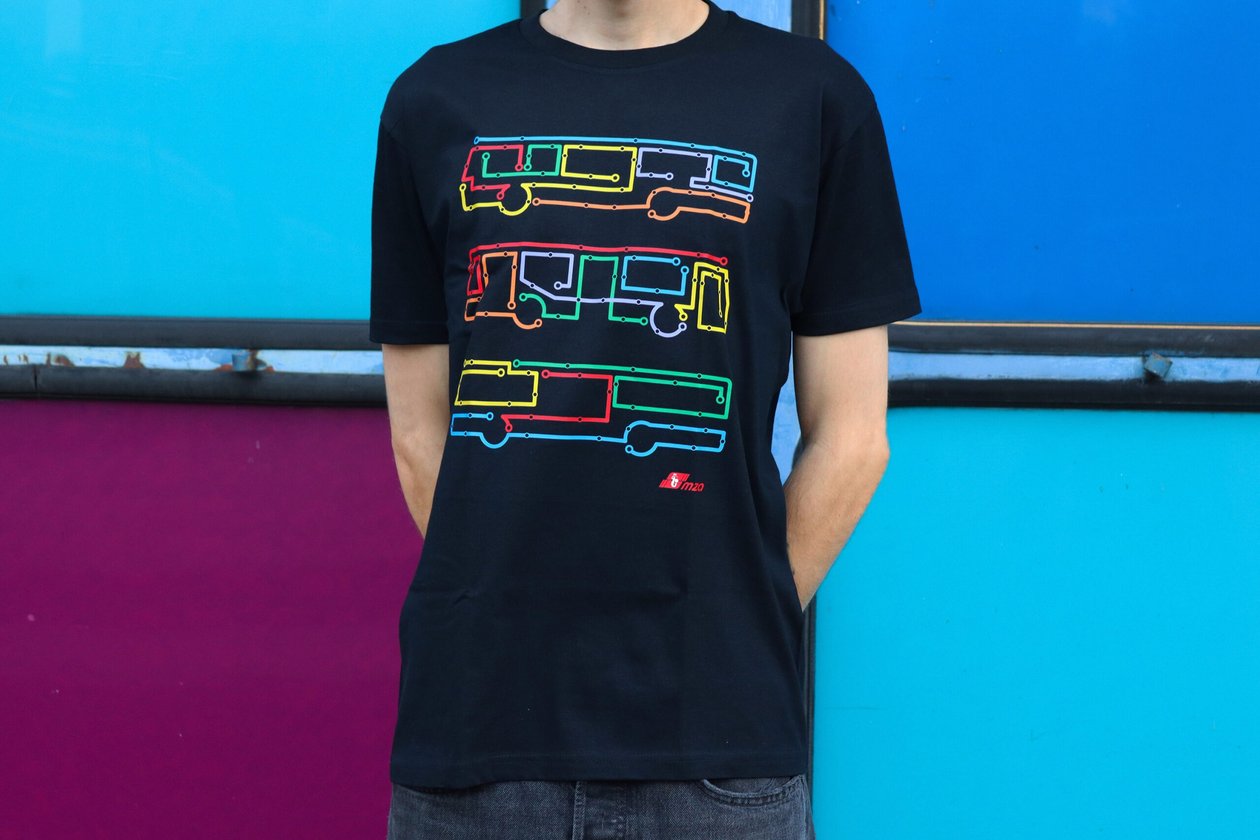 T-shirt unisex z serii „Kolorowe korale”. Czarny z kolorową grafiką w kształcie autobusów. Inspirowany tablicą informacyjną, tzw. „koralami”.