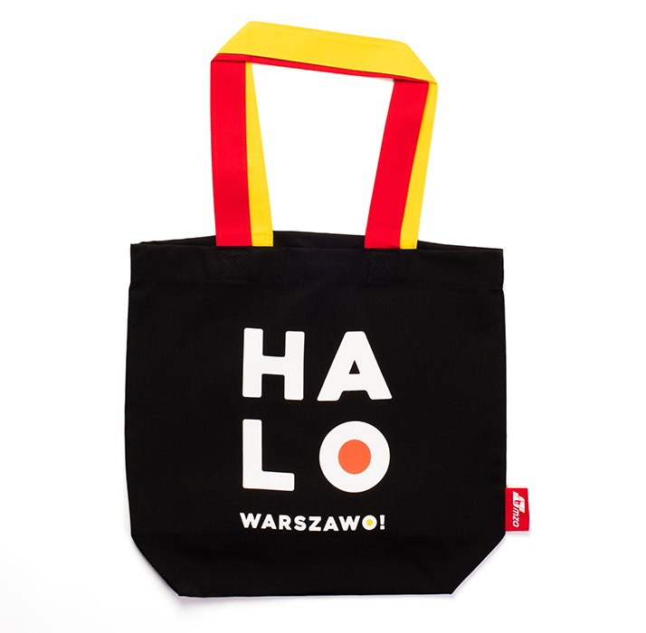 Pojemna materiałowa torba z napisem „Halo Warszawo!”. Posiada długie, solidne kolorowe uszy oraz szerokie dno.Materiał: bawełna 100%.Gramatura: 280 g/m².Wymiary: 43 x 40 x 12 cm.