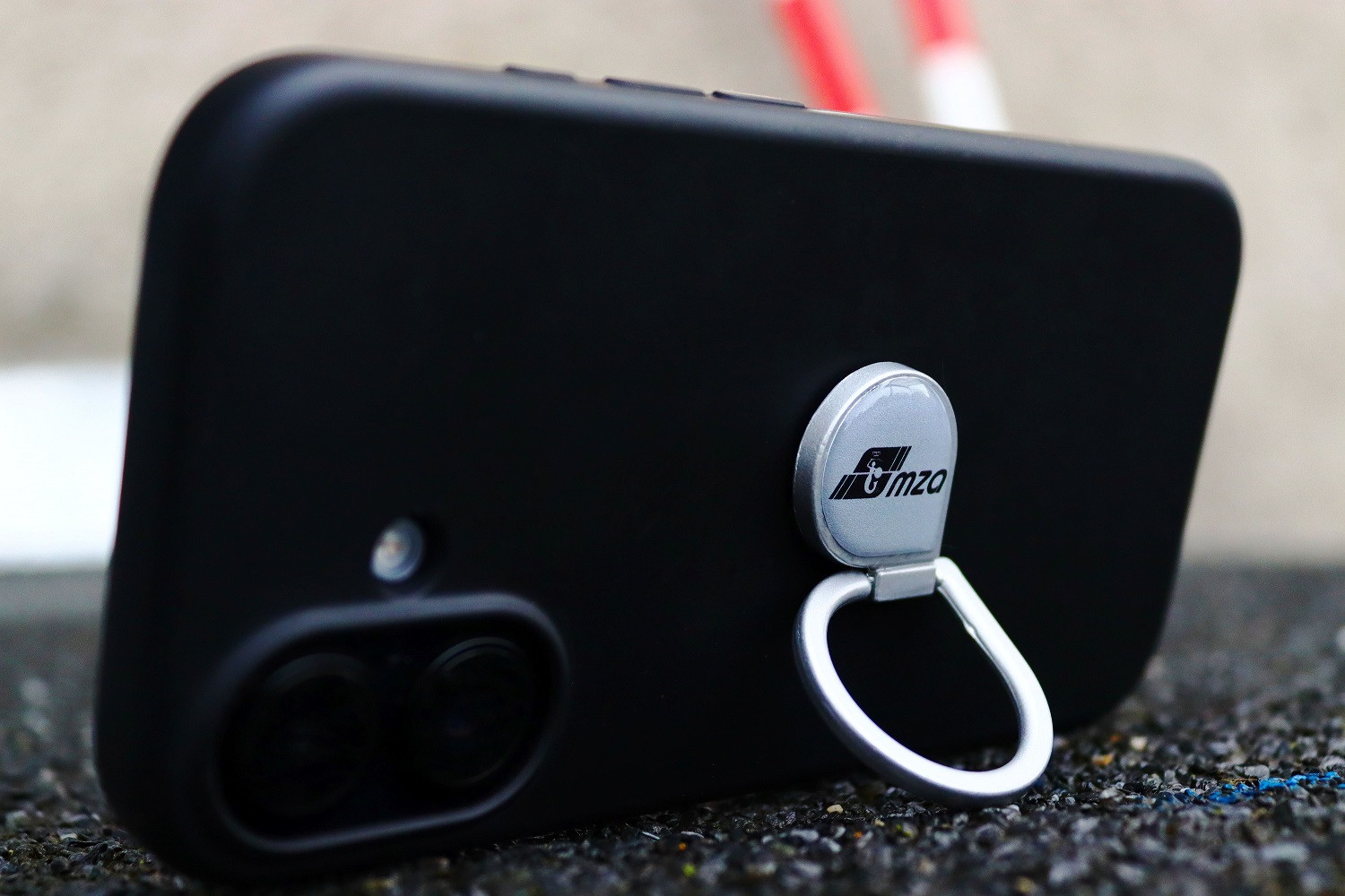 Uchwyt do telefonu z logo MZA typu ring holder/pop socket, który spełnia również rolę podstawki.