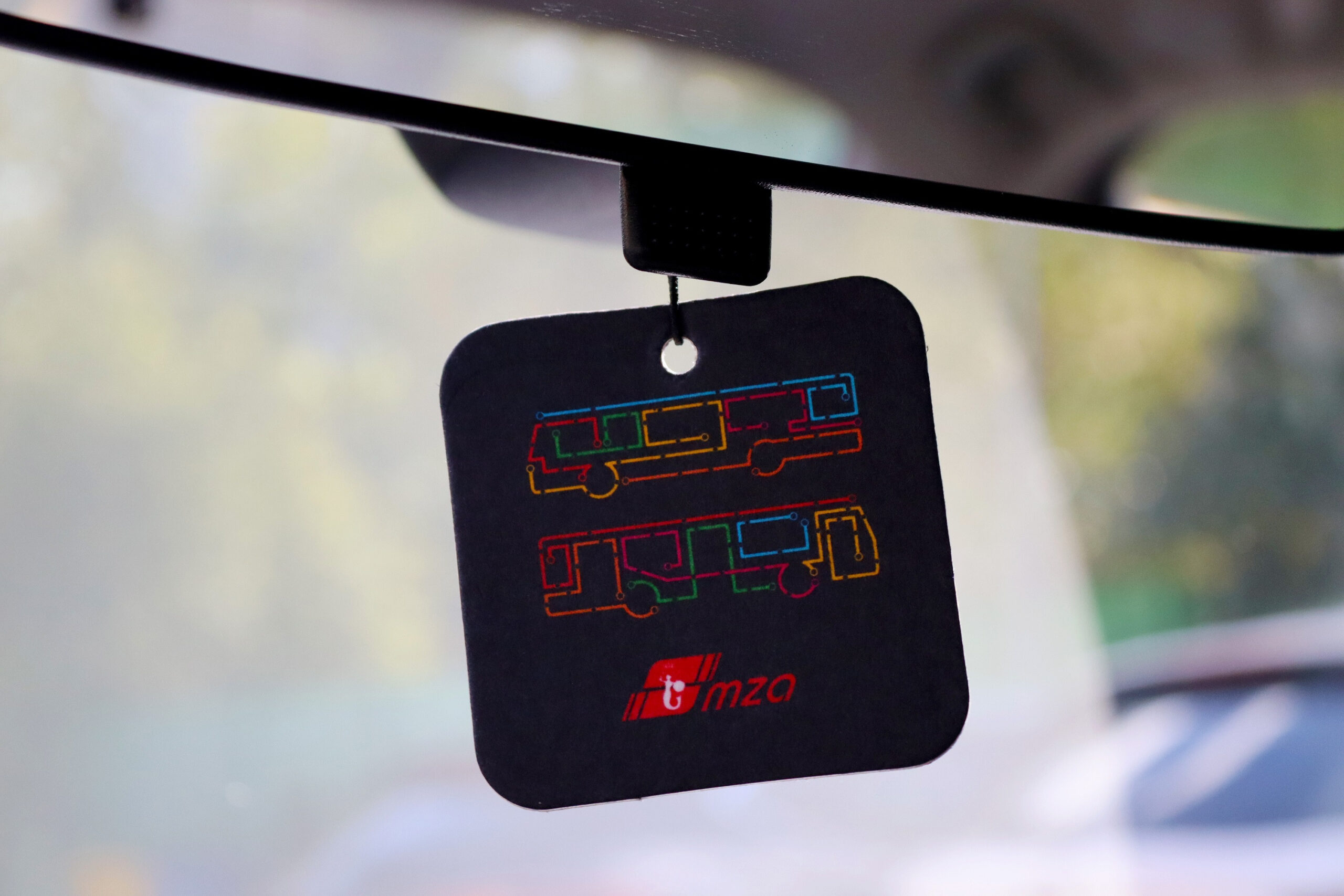 Zawieszka zapachowa z serii „Kolorowe korale”. Czarna z kolorową grafiką w kształcie autobusów. Inspirowana tablicą informacyjną, tzw. „koralami”.